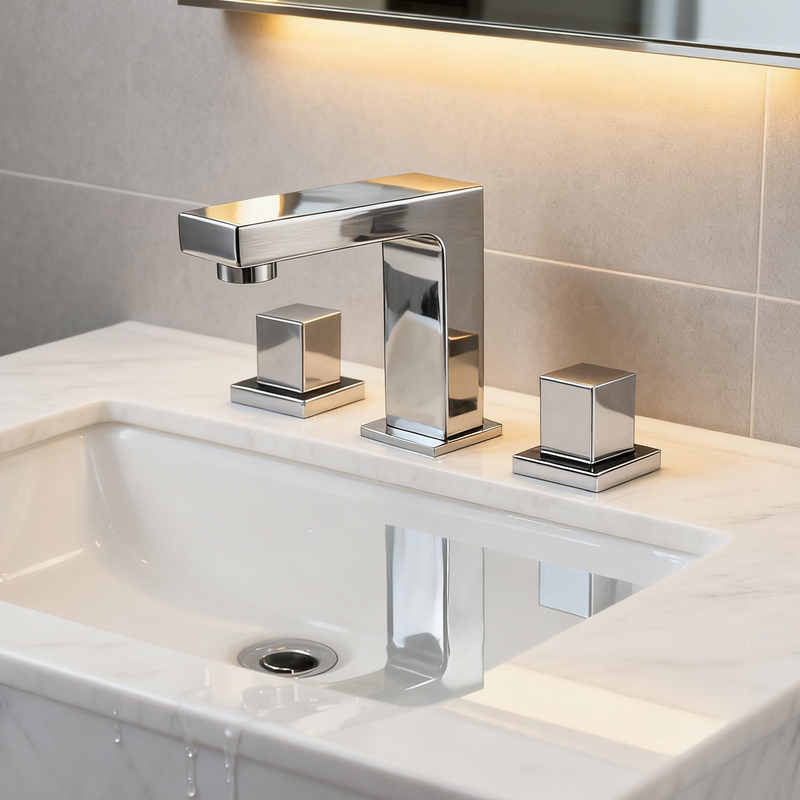 This polished chrome widespread bathroom sink faucet is adaptable for diverse project scenarios. In North American and Asian residential renovations, it adds geometric flair to master baths, with its sprayer-like flow suiting vessel sinks in luxury homes. Commercial applications in hotels or offices leverage its copper durability for high-traffic hygiene, facilitating quick rinses in shared spaces. Designers integrate it into modern or minimalist builds, where the rectangular spout complements open vanities or eco-designs. It supports sustainable projects with water efficiency. Contractors value its widespread adaptability, simplifying installations in GEO new constructions or retrofits.